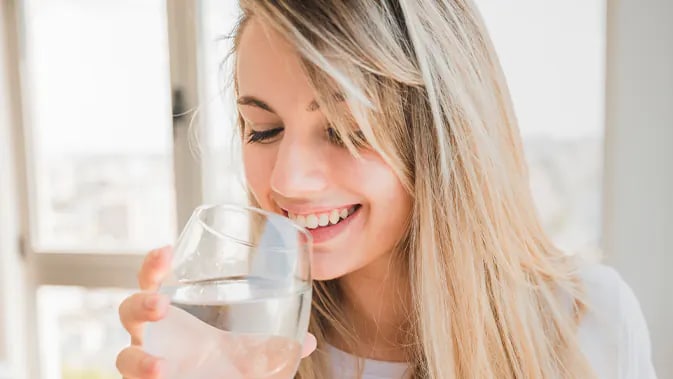 Direkt nach dem Aufstehen solltest du ein großes Glas Wasser auf nüchternen Magen trinken. Während der Nacht hast du über deinen Atem und die Haut bis zu einem Liter Flüssigkeit verloren.
